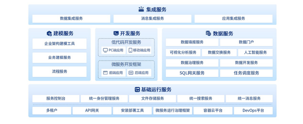 ASP+基礎(chǔ)運(yùn)行服務(wù):提供了云原生、微服務(wù)、組件化、服務(wù)化等基礎(chǔ)運(yùn)行環(huán)境和可復(fù)用的基礎(chǔ)技術(shù)組件、可共享的技術(shù)服務(wù),為用戶業(yè)務(wù)系統(tǒng)建設(shè),從平臺(tái)層面實(shí)現(xiàn)環(huán)境適配能力和全面安全保障能力。
